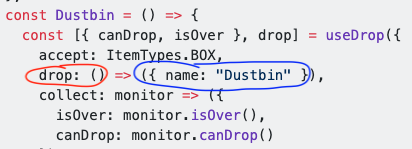 Đối với Drop nơi đón nhận sự kiện từ drag cũng vậy , nó cũng có các tham số truyền vào và ref sử dụng bằng hook useDrop ().