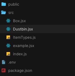 Có 3 componet chính Dustbin, Box, Example và mình sử dụng React Hook, ở bài tiếp theo mình sẽ hướng dẫn sử dụng class component
