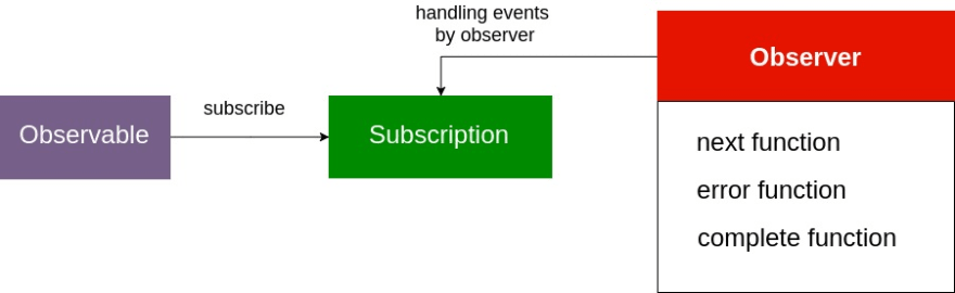- Observable chỉ là một function, cùng với 1 vài tính năng đặc trưng. Nó nhận vào một Observer (một đối tượng có các phương thức next, error và complete), và nó trả về một hàm xử lý để cancel chính Observable này.