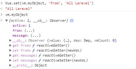 Vue.set(vm.myObject, 'from', 'All Laravel')