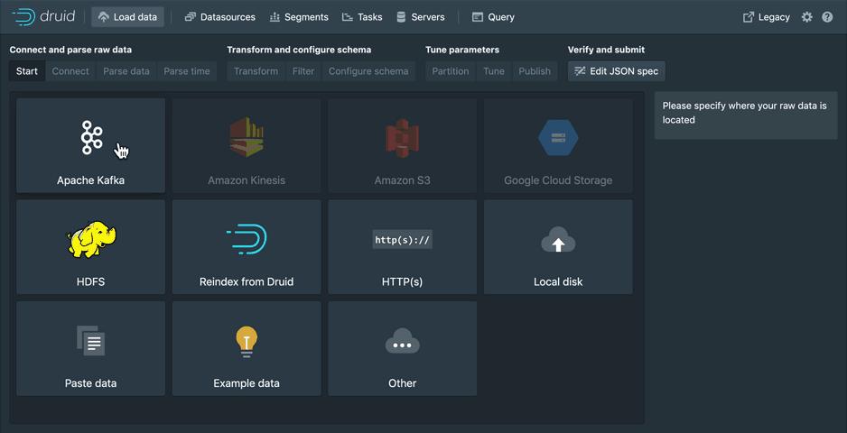 Tiếp theo là cấu hình để Druid nhận dữ liệu từ topic demo trong kafka. Từ Druid Service http://localhost:8888/ chọn load data > kafka điền thông tin kafka server kakfa:9092 và topic demo và config output.