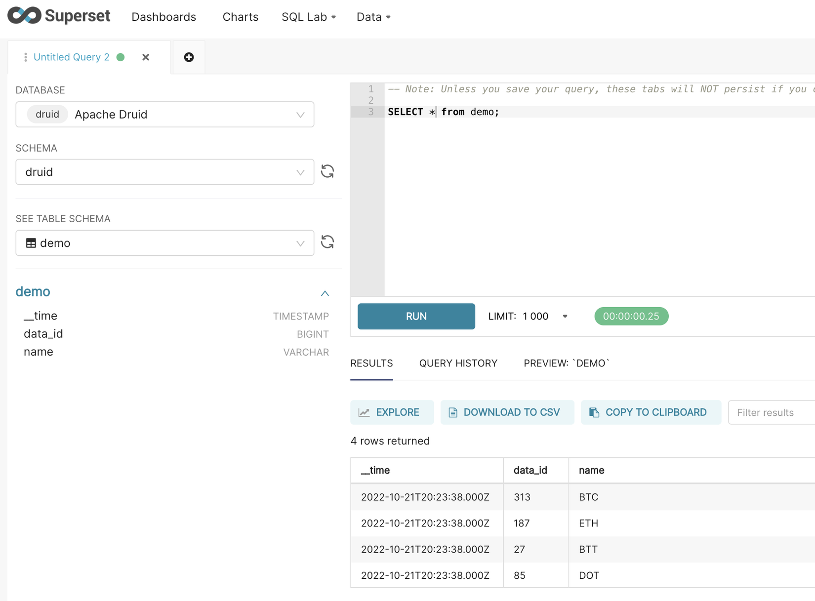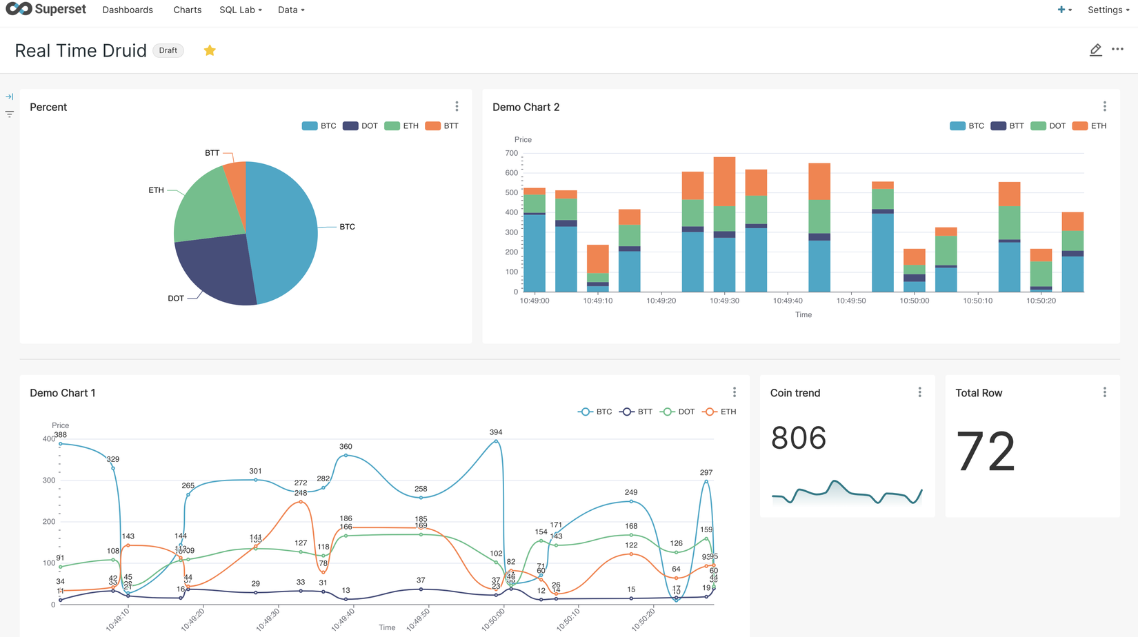 Để tạo dashboard với superset. Để tạo chart bạn cần vào SQL Lab > SQL Editor chọn database là druid , schema druid , table demo và thực hiện query theo ý mình. Sau khi hoàn tất thì explore > đặt tên cho dataset và Save & Explore chọn chart và public thành dashboard.