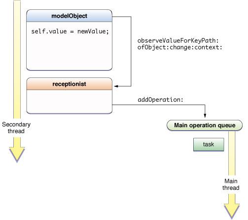 Một thông báo KVO gọi observeValueForKeyPath:ofObject:change:context: phương thức được thực hiện bởi một observer. Nếu sự thay đổi đối với thuộc tính xảy ra trên một luồng thứ cấp, thì observeValueForKeyPath:ofObject:change:context: code thực thi trên cùng một luồng. Có đối tượng trung tâm trong mẫu này, hoạt động như một trung gian luồng. Như Hình minh họa, một đối tượng receptionist được chỉ định là observer thuộc tính mô hình đối tượng property. Receptionist thực hiện observeValueForKeyPath:ofObject:change:context: để chuyển hướng thông báo nhận được trên một luồng phụ sang bối cảnh thực thi khác trong hàng đợi hoạt động chính, trong trường hợp này. Khi property thay đổi, receptionist nhận được thông báo KVO. receptionist ngay lập tức thêm một hoạt động khối vào hàng đợi hoạt động chính,khối chứa code được chỉ định bởi máy khách mà cập nhật giao diện người dùng một cách thích hợp.
