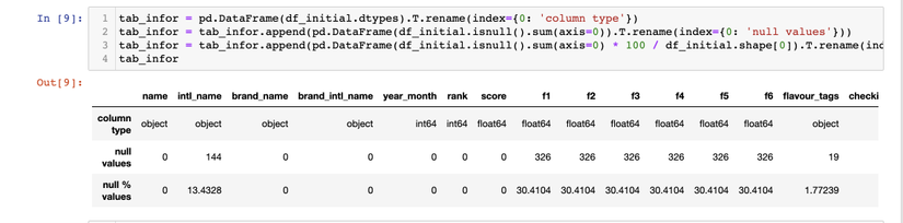 Chúng ta có khoảng hơn 1k bản ghi, nhưng f1-f6 và flavour_tags lại đang bị null đến hơn 30%, cách giải quyết sẽ là như thế nào, nếu bỏ qua tất cả những bản ghi này thì thật sự sẽ rất lãng phí. Qua quá trình quan sát, tớ nhận thấy những field nào có flavour_tags có phần giống nhau sẽ có xu hướng f1-f6 tương tự nhau, vì vậy chắc chắn chúng có mối quan hệ gì rồi. Chúng ta sẽ nói đến việc xử lý với chỗ dữ liệu null này như thế nào ở phần tiếp theo nhé.