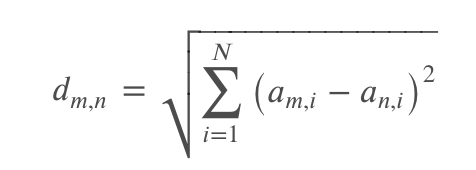 Ở matrix này, hệ số ajk sẽ có giá trị 0 hoặc 1 phụ thuộc vào giá trị ở column k và content flavour_tags ở cột j. Ví dụ: nếu tag_k trong flavour_tags của liquor_j thì ajk = 1, ngược lại = 0. Khi xây dựng xong matrix ta tính khoảng cách giữa các vector theo công thức: