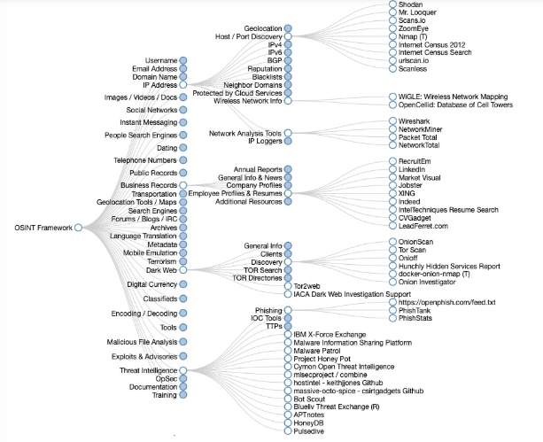 Một nơi khá là phù hợp để bắt đầu là OSINT Framework, một framework được tạo bởi Justin Nordine. Khung này cung cấp các liên kết đến các nhóm các tài nguyên cho rất nhiều nhiệm vụ từ thu thập địa chỉ email đến tìm kiếm phương tiện truyền thông xã hội hoặc deepweb.