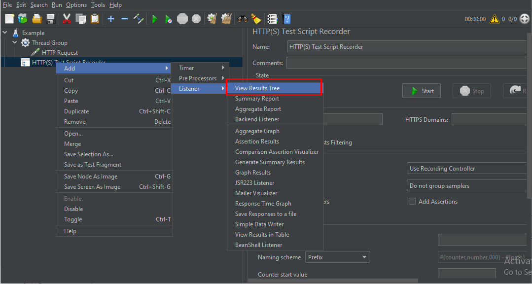 Bước 7: Sau khi thiết lập xong proxy trên Firfox, bạn click button Start ở HTTP(s) Test Script Recorder để bắt đầu chạy. Đây được hiểu là một element “kết nối” Jmeter và Browser, tức là khi chúng ta thực hiện các thao tác để recording thì nó có nhiệm vụ bắt các request được bắn từ browser và đẩy vào Jmeter.