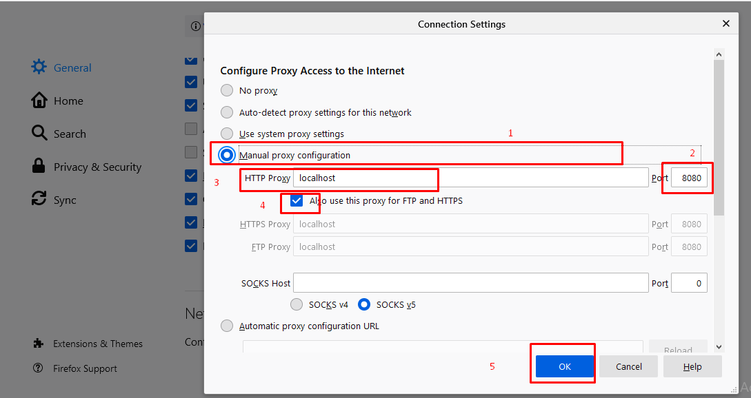 Sau đó bạn chọn General -> Network settings -> Settings… Và set như mình đây nhé. Port chính là con số bạn nhập ở Bước số 4