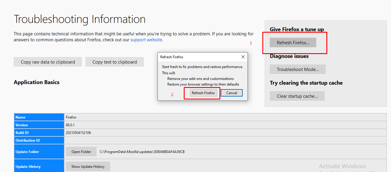 Từ trình duyệt Firefox mở : Menu > Help > More Troubleshooting Information > Refresh Firefox