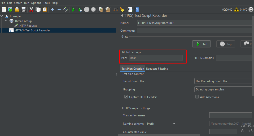 Bước 4: Tạo test script recorder. Phần Global Setting là nơi chúng ta nhập cổng Post giao tiếp giữa Jmetter à Firefox. Ở đây mình để 8080, các bạn có thể để 8888 cũng được