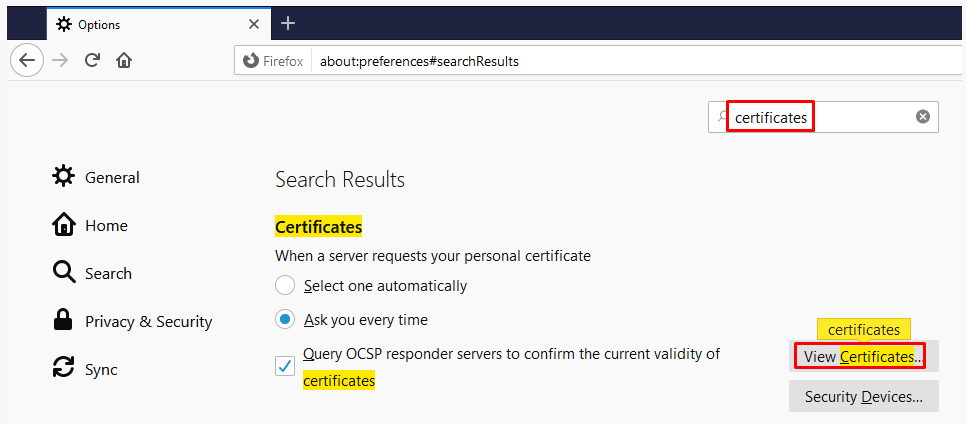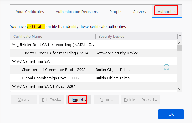 Bước 8: Bạn mở trình duyệt Firefox, click Options ở phần tìm kiếm bạn search từ khóa ‘certificates’ và click ‘View Certificates…’ và chọn tab Authorities > Import > folder bin của Jmeter > ApacheJmeterTemporaryrootCA.crt > click button Open