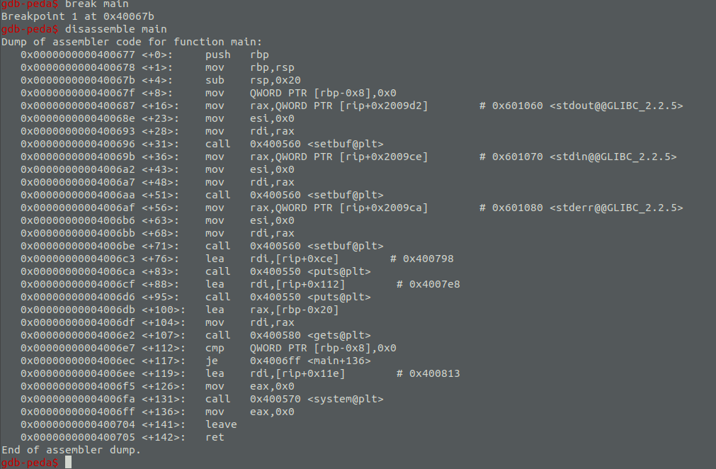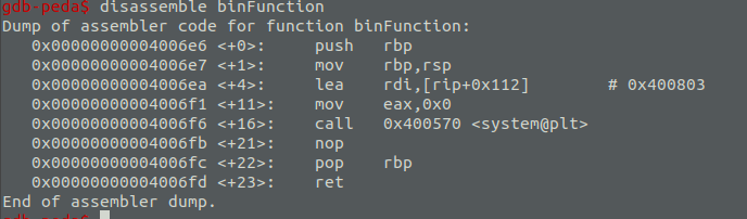 Sử dụng gdb để tìm tới địa chỉ hàm binFunction tại 0x04006e6 cùng với offset 24 tương tự cách tính bên trên