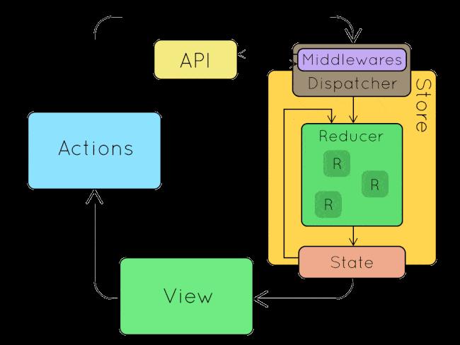 Nhìn trên hình trên các bạn cũng có thể thấy chúng ta có Actions, Store, State , Reducers, ngoài ra có thêm phần middlewares tuy nhiên ở mức cơ bản nhất chúng ta sẽ cần học 4 thứ trên đầu tiên. Với views chính là phần hiển thị UI tương tác với người dùng. Flow sẽ là :