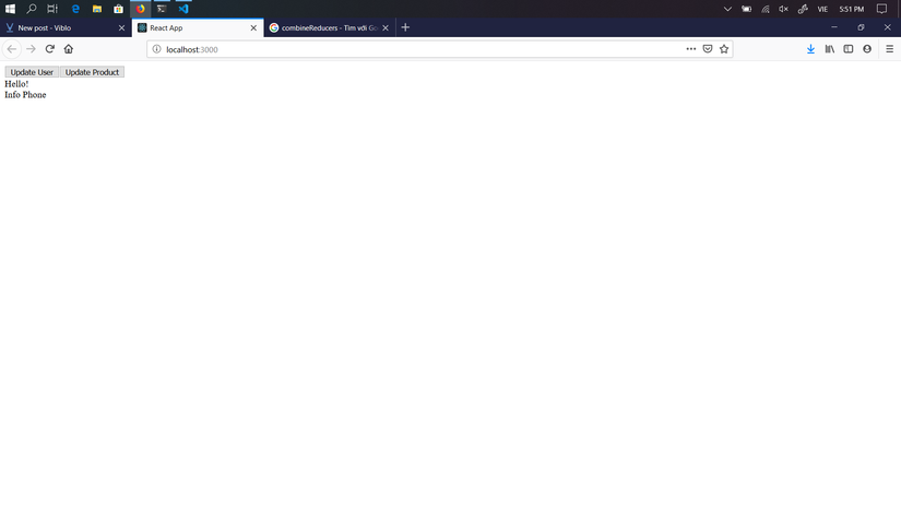 - Tiếp theo App.js// Thêm Component import React, { Component } from 'react'; // Thêm connect để có thể kết nối tới Provider lấy dispatch và state import { connect } from 'react-redux'; // Giữ lại các action bên file này để thực hiện việc click button lấy dữ liệu const userAction = { type: 'UPDATE_USER', payload: 'Trung', } const productAction = { type: 'UPDATE_PRODUCT', payload: [ {name: 'iPhone XR'}, {name: 'Samsung Galaxy S10'}, ], } // Tạo mapDispatchToProps để dispatch vào props const mapDispatchToProps = (dispatch) => { return { userDispatch: () => dispatch(userAction), productDispatch: () => dispatch(productAction), } } // Tạo mapStateToProps để chuyển state vào props const mapStateToProps = (state) => { return { user: state.userReducer, products: state.productReducer, } } // Chuyển đổi function App thành class App để tiện cho việc xử lý dữ liệu class App extends Component { render() { // Vì đã ta đã chuyển dispatch và state vào trong props nên ta chỉ việc gọi nó như một props bình thường const { user, products, userDispatch, productDispatch } = this.props; // Thay store thành products const renderdataStore = products.map((data, index) => { return <li key={`store-${index}`}>{data.name}</li> }); return ( <div> // Thay store thành uerDispatch và productDispatch <button onClick={() => userDispatch(userAction)}>Update User</button> <button onClick={() => productDispatch(productAction)}>Update Product</button> <div>Hello! {user}</div> <div>Info Phone</div> <ul> {renderdataStore} </ul> </div> ); } } // Điều quan trọng nhất là phần kết nối bên dưới nếu muốn lấy được dữ liệu export default connect(mapStateToProps, mapDispatchToProps)(App);