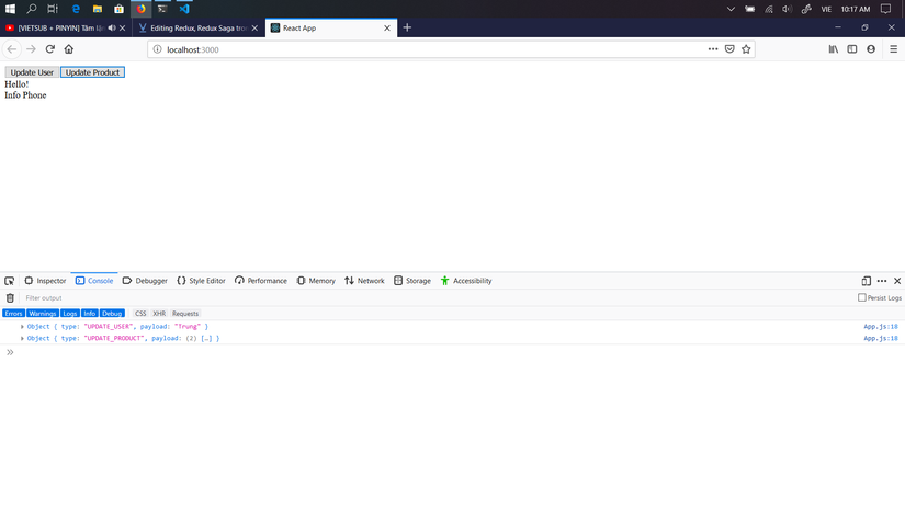 - Khi console.log trong reducer sẽ thấy có thêm các action khác và mặc dù chỉ console.log trong 1 reducer khi click vào 1 trong 2 nút thì vẫn thấy nó console ra dữ liệu của action còn lại, cái này thì mọi người tự tìm hiểu nha, mình không giải thích đâu =))