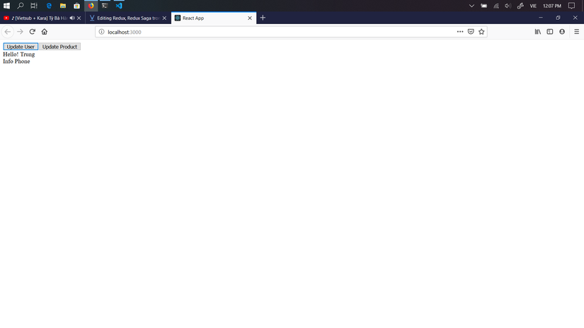 Đầu tiên là file index.js import React from 'react'; import ReactDOM from 'react-dom'; import { Provider } from 'react-redux'; // Thêm applyMiddleware để redux có thể sử dụng redux-saga import { createStore, combineReducers, applyMiddleware } from 'redux'; // Gọi function createSagaMiddle import createSagaMiddleware from 'redux-saga'; // Các hàm effects trong redux-saga, công dụng của nó sẽ được nói ở phía dưới import { put, call, all, takeLatest } from 'redux-saga/effects'; import App from './App'; import * as serviceWorker from './serviceWorker'; const userReducer = (state = '', action) => { switch(action.type) { // Chuyển UPDATE_USER thành UPDATE_USER_SUCCESS vì hiện tại ta đang lắng nghe từ saga case 'UPDATE_USER_SUCCESS': return action.payload; default: return state; } } const productReducer = (state = [], action) => { switch(action.type) { case 'UPDATE_PRODUCT_SUCCESS': return action.payload; default: return state; } } const allReducers = combineReducers({ userReducer, productReducer, }); // Sử dụng function* thay cho function bình thường và arrow function // Để có thể sử dụng synchronous trong js // Còn vì sao phải sử dụng thì mọi người tự search nha :v function* userSaga(action) { // id của action.payload được nhận từ action bên file App.js // Mình đang giả lập khi gửi id để put, patch bên api const { id } = action.payload; // call trong thực tiễn là sẽ được dùng gọi các api // Ở đây mình chỉ giả lập trả về const result = yield call(() => { return id === 1 ? 'Trung' : ''; }); // put là để trả về cho reducer giá trị yield put({ type: 'UPDATE_USER_SUCCESS', payload: result, }); } function* productSaga(action) { const { id } = action.payload; const result = yield call(() => { return id === 2 ? [ {name: 'iPhone', gen: 7}, {name: 'Galaxy', gen: 8}, ] : []; }); yield put({ type: 'UPDATE_PRODUCT_SUCCESS', payload: result, }); } // viết một saga tổng function* rootSaga() { // all thôi mọi người tự hiểu =)) yield all([ // takeLatest lắng nghe action cuối takeLatest('UPDATE_USER', userSaga), takeLatest('UPDATE_PRODUCT', productSaga), ]); } // Tạo sagaMiddleware const sagaMiddleware = createSagaMiddleware(); const store = createStore( allReducers, applyMiddleware(sagaMiddleware), ); // Để có thể lắng nghe action thì phải chạy sagaMiddleware sagaMiddleware.run(rootSaga); ReactDOM.render( <Provider store={store}> <App /> </Provider>, document.getElementById('root') ); // If you want your app to work offline and load faster, you can change // unregister() to register() below. Note this comes with some pitfalls. // Learn more about service workers: https://bit.ly/CRA-PWA serviceWorker.unregister();