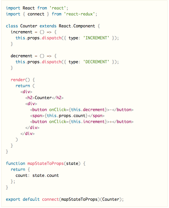 Hàm mapStateToProps() sử dụng để lấy count từ Store mà Counter component yêu cầu, count trả về sẽ là props của component. Nhưng chỉ mapStateToProps() thôi chưa đủ, chúng ta cần connect() để connect tới store của app. Và cuối cùng dispatch action để thực thi là xong!