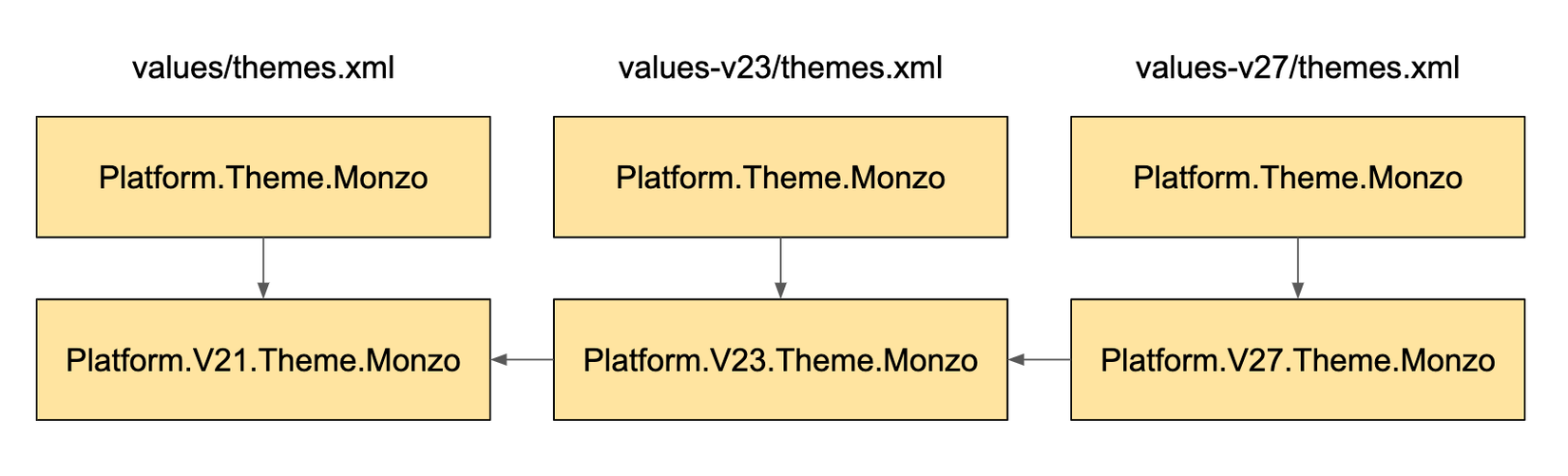 Platform.Theme.Monzo Platform.Theme.Monzođược định nghĩa trong mỗi nhóm tài nguyên nơi chúng ta cần các thuộc tính dành riêng cho phiên bản- Mỗi phiên bản của Platform.Theme.Monzo phụ thuộc vào tài nguyên chủ đề dành riêng cho phiên bản, ví dụ: