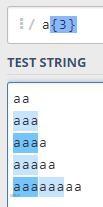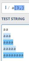 x{n,}tìm được chuỗi x lặp lại ít nhất n lần (n > 0). Ví dụa{3,}sẽ tìm chuỗi có ít nhất 3 chữ a liền nhau.