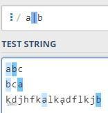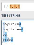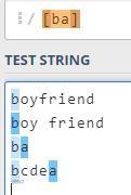 [xyz]tìm ra chuỗi có chứa 1 ký tự trong chuỗi ở trong dấu ngoặc vuông (hoặc x hoặc y hoặc z). Ví dụ:[ba]sẽ trùng khớp với b hoặc a.