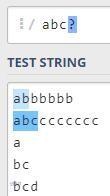 ?(thực sự là mình không biết phải giải thích bằng lời thế nào nên các bạn xem tạm ví dụ để hiểu nhé). Ví dụ;abc?sẽ tìm ra chuỗi "ab", "abc" nhưng lại không tìm ra chuỗi "abbbbb" hay "abcccccccc"