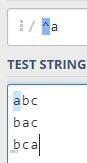 ^xdấu mũ khi không đặt trong [] sẽ tìm ra ký tự/chuỗi ký tự đứng đầu tiên trong 1 chuỗi. Ví dụ:^asẽ tìm ra ký tự a đứng đầu trong chuỗi, tức là chuỗi "abc" thì tìm được nhưng chuỗi "bac". "bca" thì không,