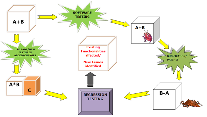 Hơn nữa, chúng ta cũng có thể thấy rằng trong quá trình nâng cấp hoặc bổ sung tính năng mới; C , các chức năng hiện có của ứng dụng; A + B đã bị ảnh hưởng với sự thay đổi chức năng; A * B . Ở đây, các kiểm tra hồi quy cũng được thực hiện trên ứng dụng phần mềm để tìm hiểu xem các chức năng hiện có có bị ảnh hưởng hay không.