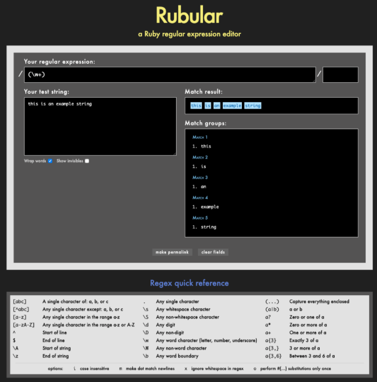- Rubular cung cấp 1 số tính năng như hiển thị Regex quick reference, hiển thị các Match result, ...