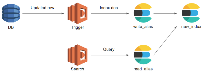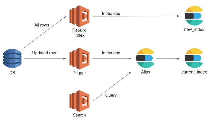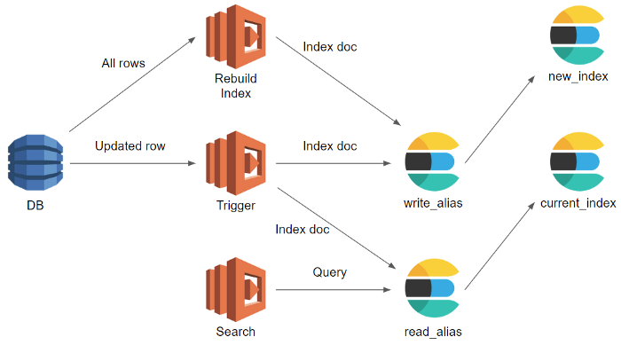 Sơ đồ tham khảo sử dụng AWS service, thay đổi trong DB sẽ được update lên index cũ, việc search vẫn được thực hiện bình thường qua index cũ, index mới được rebuild trong quá trình này