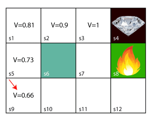 Giả sử rằng chúng ta có một trò chơi đơn giản minh họa bởi ảnh phía trên với mục tiêu là lấy được viên kim cương, agent sẽ bắt đầu từ ô s9, vậy một giải pháp đơn giản chúng ta có thể thấy là agent sẽ di chuyển lần lượt qua các ô s5-s1-s2-s3 để tới được viên kim cương với quãng đường là ngắn nhất. Tuy nhiên, nếu agent được đặt tại vị trí s1, khi đó agent sẽ có 2 hướng đi với các giá trị như nhau. Vậy chúng ta làm thế nào để đảm bảo được agent sẽ thực hiện đúng những hành động tối ưu mà chúng ta muốn? Đó là tạo một memory (bộ nhớ) cho agent, sử dụng Bellman Equation. Dưới đây là công thức: