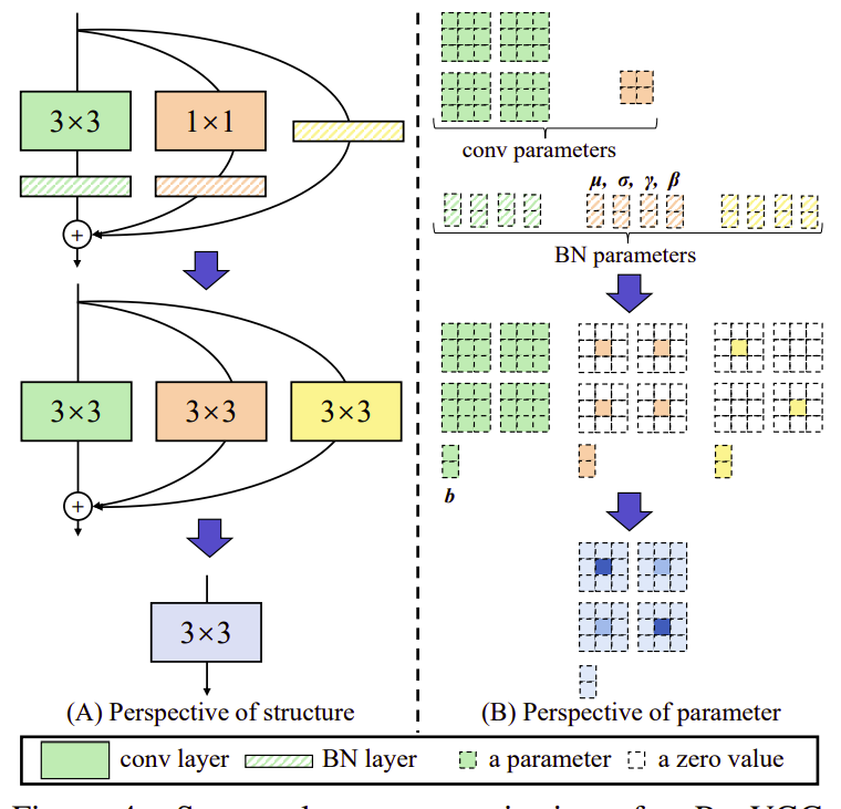 Để chuyển tham số giữa hai kiến trúc đơn nhánh và đa nhánh thì batch normalization giữa hai kiến trúc đa nhánh và đơn nhánh phải tương ứng với nhau do đó kích thước của phải giống nhau để có thể thực hiện phép cộng tương ứng. Do có kích thước lần lượt là 1x1, 3x3, 1x1 để cùng kích thước cần phải padding các giá trị 0 vào cùng kích thước với .
