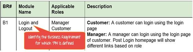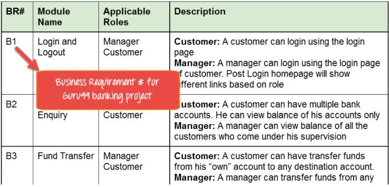 Giả sử, bảng sau đây là Tài liệu yêu cầu nghiệp vụ (BRD) cho dự án ngân hàng Guru99.