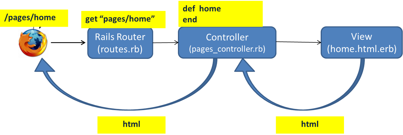 Trong sơ đồ trên, yêu cầu của người dùng đối với URL pages/home sẽ đi từ trình duyệt của người dùng đến Rails Router. Sau đó routes sẽ quyết định rằng request trên sẽ được xử lý bởi pages_controller.rb và action home tương ứng. Cuối cùng một response được trả về cho user (controller render HTML lại cho user).