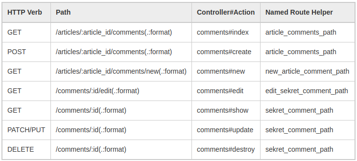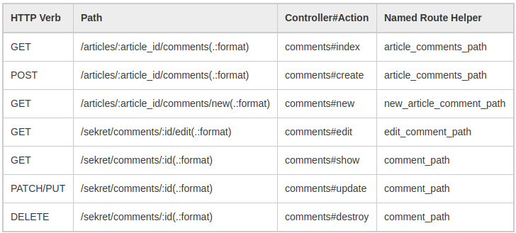 - Comments resource ở đây sẽ có các routes sau được tạo cho nó: