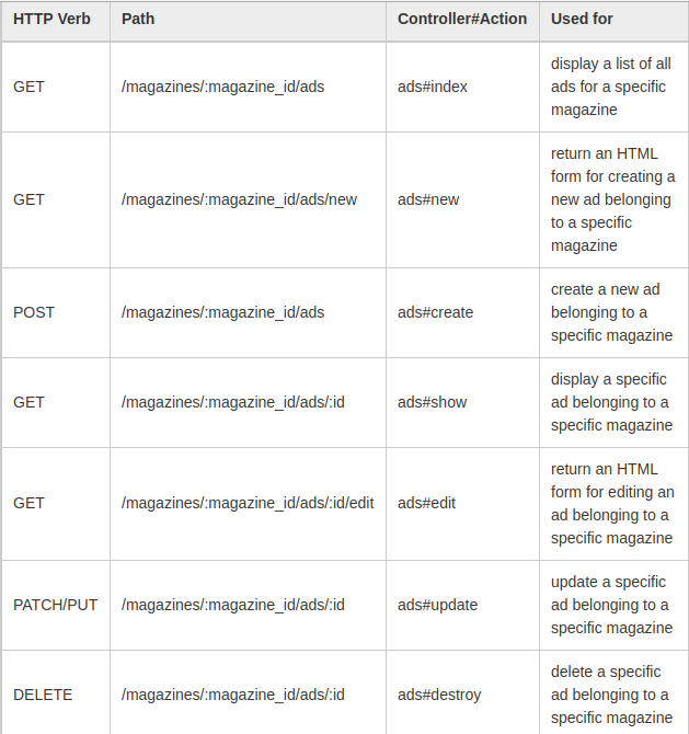 - Điều này sẽ tạo ra các routes chính xác giống như ví dụ đầu tiên. Bạn cũng có thể chỉ định tùy chọn :shallow trong resource gốc, trong trường hợp đó, tất cả các resources lồng nhau sẽ là shallow: