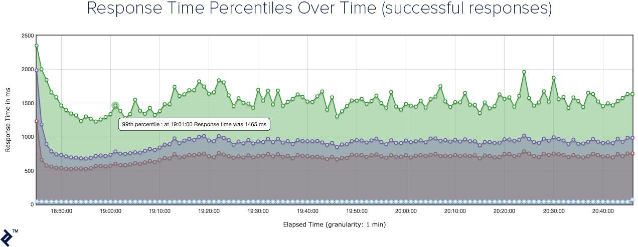 Apache JMeter, do mục đích chính của nó, có một số lượng lớn các loại báo cáo mà bạn có thể tạo ra từ kết quả kiểm tra của bạn. Vì bạn có thể chạy test performance từ JMeter, các chỉ số performance không được sử dụng bằng cách sử dụng các biểu đồ như sau: