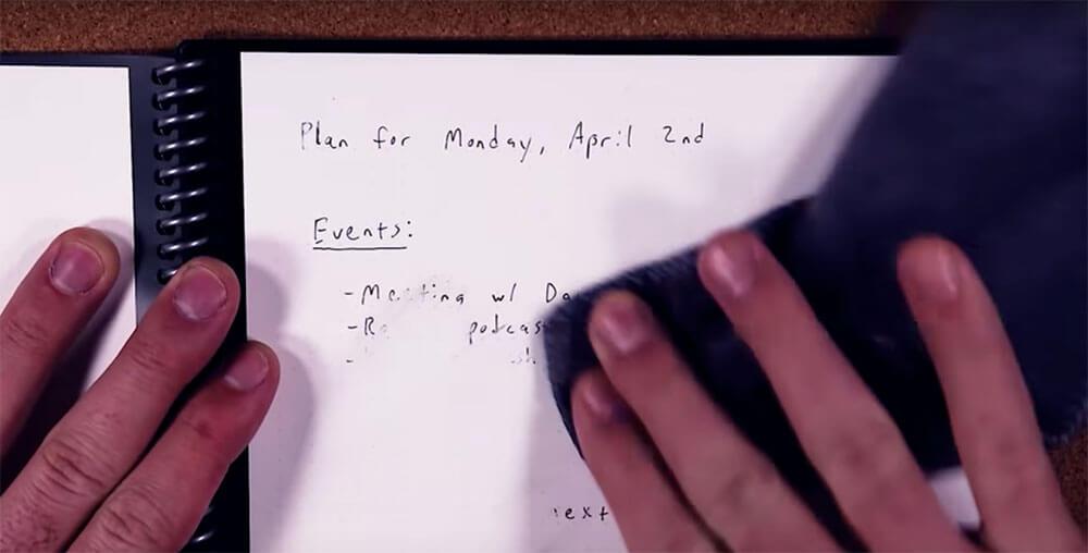 You can write in the notebook with the included FriXion pen, take a picture to scan notes, and seamlessly send a PDF or JPEG of your writing to to a host of destinations (email, messages, iCloud, Google Docs , Dropbox and more). Then, when you’re done and want a new page, grab a wet cloth and wipe it down. Your notes are off, and you can start the process again.