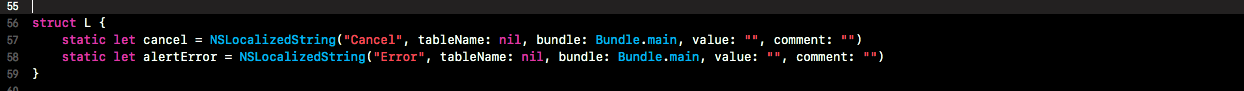 Trước đây mỗi khi dùng đến file Localizable.strings để quản lý text trong một project. Để code được đẹp và sử dụng nó được dễ hơn tôi sẽ tạo một struct như sau :
