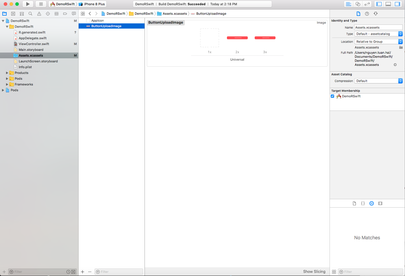 Quản lý và tránh hard code cho tên các icon, image trong Assets.xcassets. Tôi cũng làm tương tự như làm việc với file .strings và tôi thấy thực sự bất tiện và khó chịu khi cứ phải khai báo ở 2 file khác nhau. Nhiều lần như vậy tôi đã cảm thấy ức chế nhưng không biết làm gì hơn. Rất may với RSwift tôi đã gỡ bỏ được sự bực tức đó ra khỏi thời gian code của tôi. Vì bạn sẽ bỏ qua được bước thêm biến vào struct như tôi đã ví dụ ở trên.