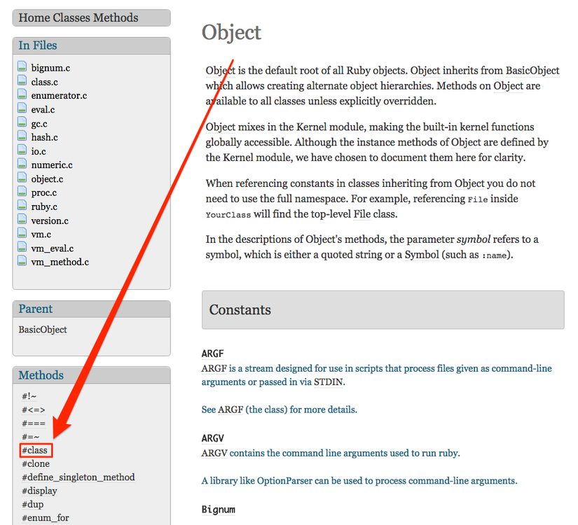 Từ trên, ta thấy rằng do String kế thừa từ Object nên nó tự động có class method (và các Object methods khác.) Ở trong phiên bản cũ hơn của Ruby, Object là base của tất cả các class, nhưng Object có rất nhiều method và kinh nghiệm chỉ ra rằng trong một số ứng dụng, ta sử dụng BasicObject class sẽ tiện lợi hơn.