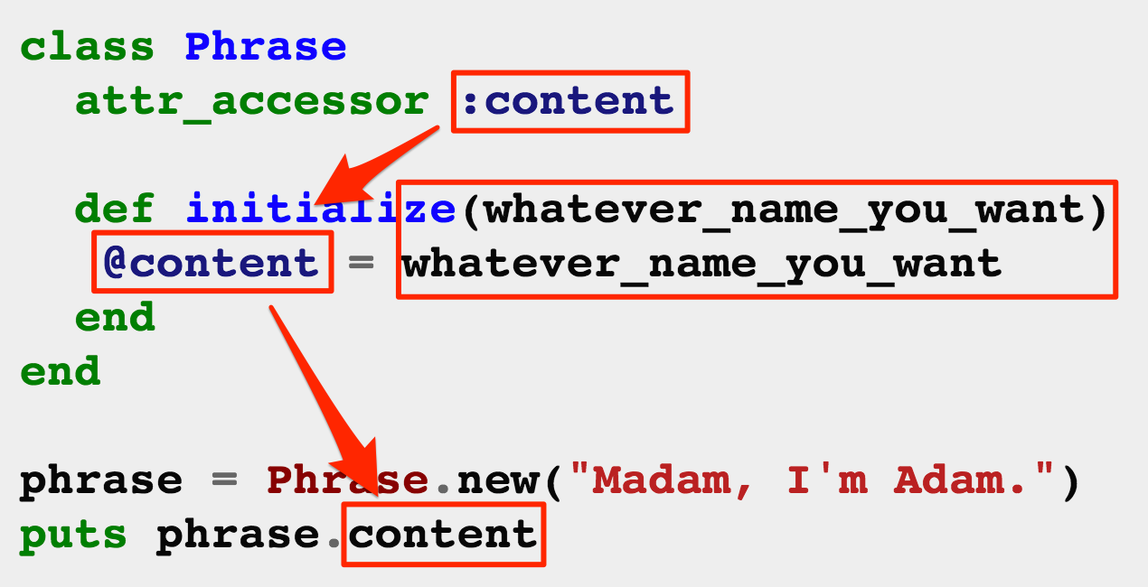 Chú ý rằng, đối số attr_accessor ở đây là một symbol, và Ruby sẽ tự động liên kết nó với instance variable có cùng tên giống nhau. Ở đoạn code bên trên, phrase.content đã dùng giá trị của @content instance variable.