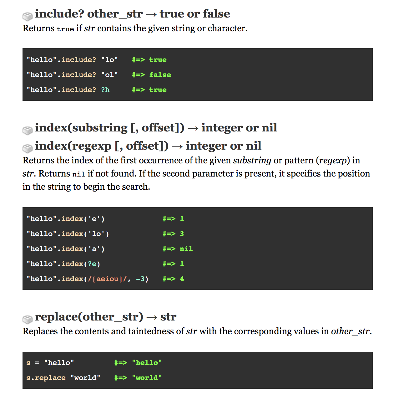 Ngoài ra khi xem document của Ruby, thì có rất nhiều method hữu ích hỗ trợ xử lý string. Hãy thử xem một số phương thức dưới đây: