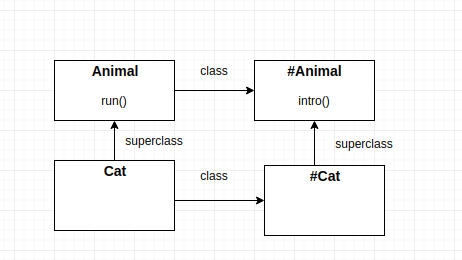 Nhưng, như đã nói ở trên intro() được định nghĩa trong singleton class của Animal (#Animal) và chỉ có thể truy cập với Animal thì tại sao ta có thể gọi intro() thông qua Cat?