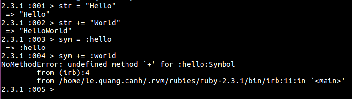 Ví dụ trên cho ta thấy, giá trị biến str là một String có thể thay đổi bằng cách cộng chuỗi để được một string mới. Nhưng không thể làm điều tương tự với biến sym là một Symbol, bởi vì Symbol là một object bất biến.