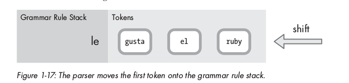 Đầu tiên,  token le được shift ( đẩy ra ) khỏi mảng tokens, đưa vào một stack ( grammar rule stack ):