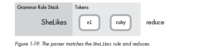 parser check các rules được defined, thấy match với rule SheLikes, do vậy, parser thay thế cặp token le + gusta thành rule SheLikes được match ( reduce ):