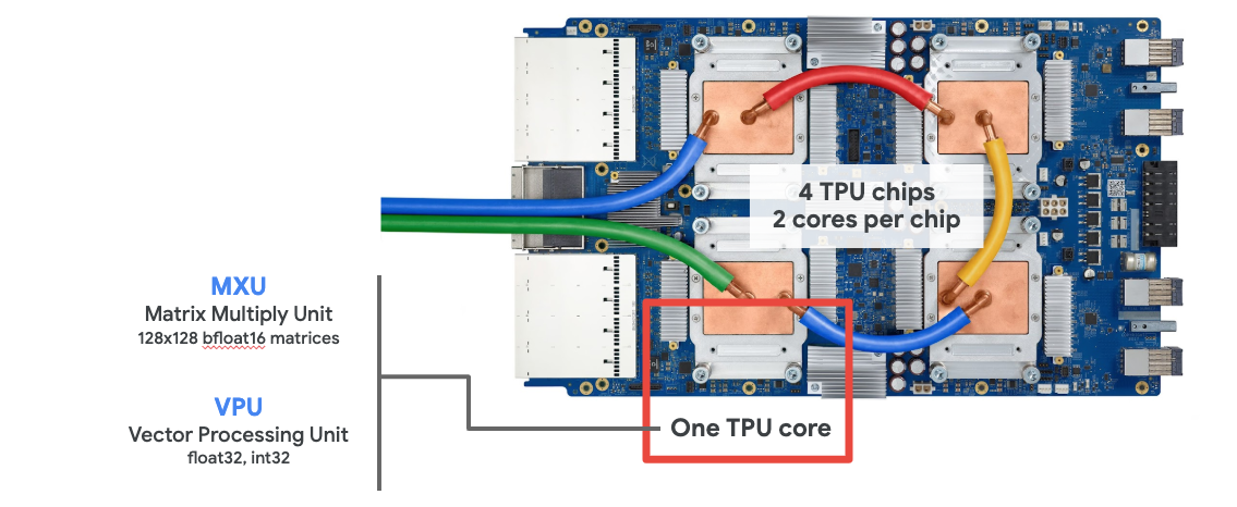 Khi bạn request một service Cloud TPU v2, bạn sẽ nhận được một máy ảo connect với một TPU board. Một TPU board có 4 core và mỗi core có một VPU và một MXU (128x128) . Khi sử dụng TPU trên colab, chúng ta sẽ nhận được cấu hình TPU tương đương vậy.