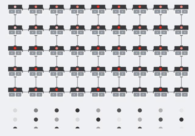 Các phần tử trong X sẽ được load vào vị trí các điểm màu đỏ, còn các phần tử trong W sẽ được load vào vị trí các điểm màu xám. Việc load dữ liệu này được mô tả trong hình vẽ trên là các điểm lần lượt di chuyển theo hàng dọc từ dưới lên trên. Tại mỗi nút thực hiện phép tính của MXU, sau khi load đủ dữ liệu tại nút đó, phép nhân được thực hiện, giá trị của phép nhân này sẽ được nút lân cận sử dụng để tính tổng tạm thời. Giá trị tổng tạm thời đó như dòng chảy từ trái qua phải giữa các nút nên không cần thêm một biến trung gian hay bộ nhớ tạm thời nào khác. Cấu trúc của MXU này được gọi là Systolic array. Nhờ vào cấu trúc này, TPU có tốc độ thực hiện phép tính cao và tiết kiệm năng lượng.