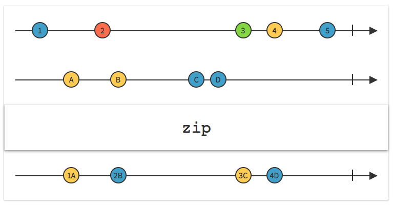 Như hai operator trên, zip gộp cã 2 hay nhiều giá trị từ các streams khác nhau. Khác nhau duy nhất là nó sẽ đợi cho đến khi một giá trị mới từ từng stream phát ra. Xem diagram ở dưới sẽ rõ nhé: